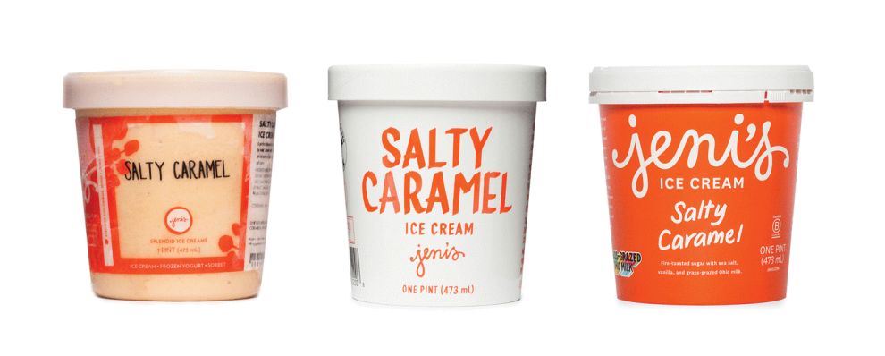 杰西卡重新设计了标志性的、个性化的标志设计和个性化的包装设计,值得精心呵护,并花费数百个小时来制作 jeni's 的每种口味。从草书字体到酷味十足的轮廓,这都是jeni's引以为傲的东西。